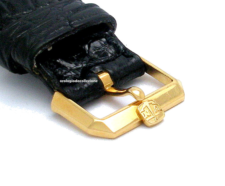 • BRACELET: Black crocodile starp with gold boucle.