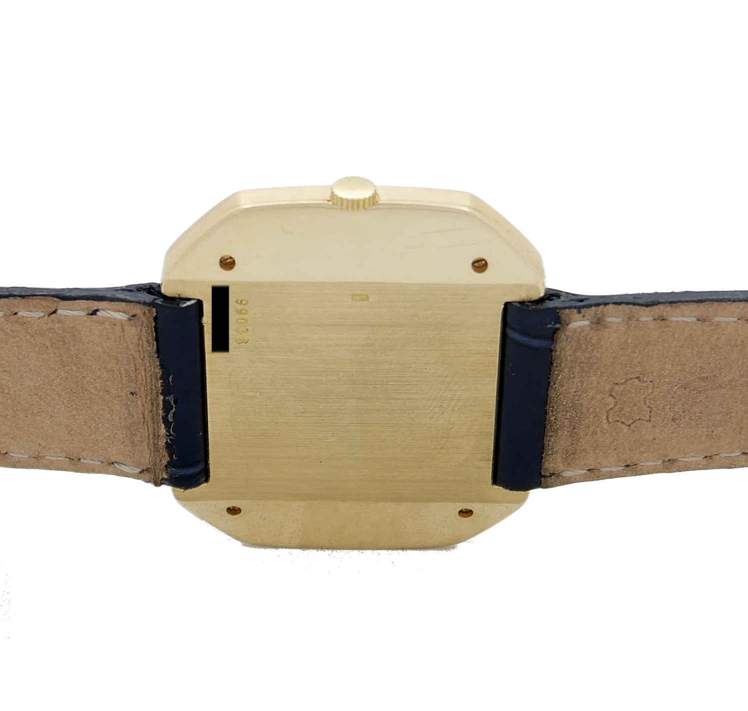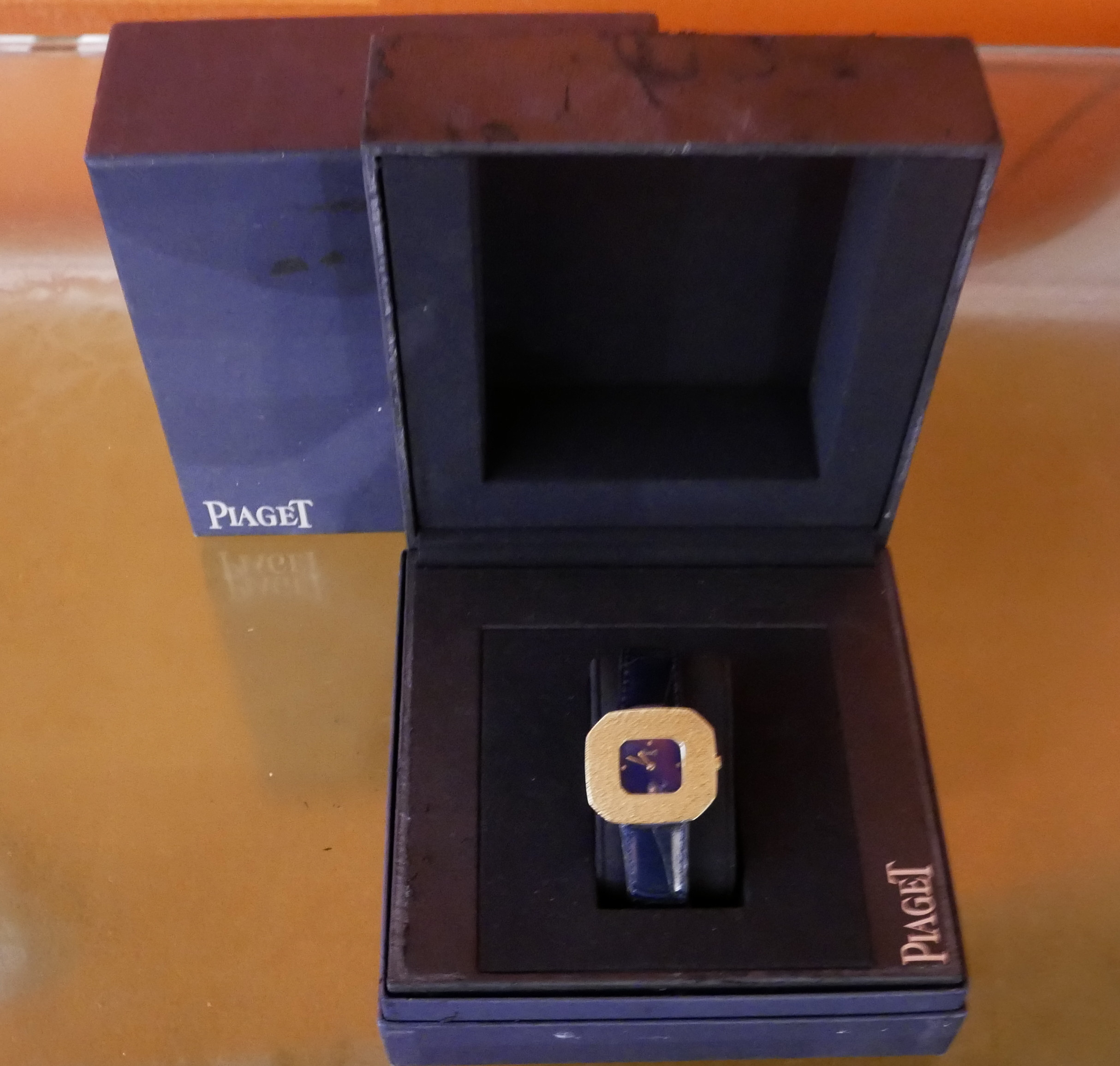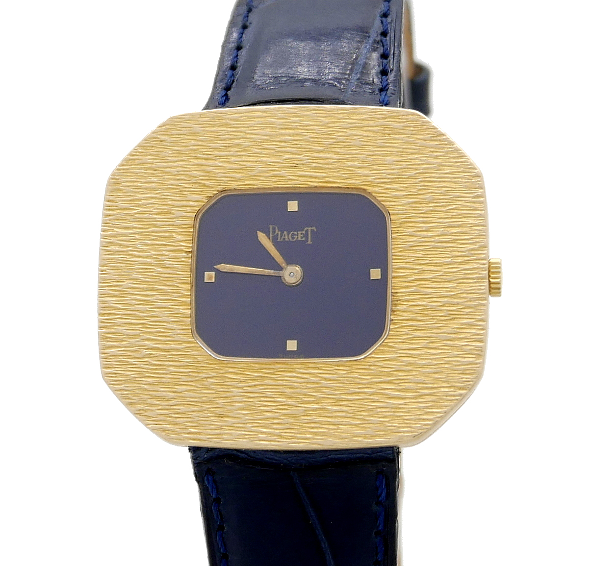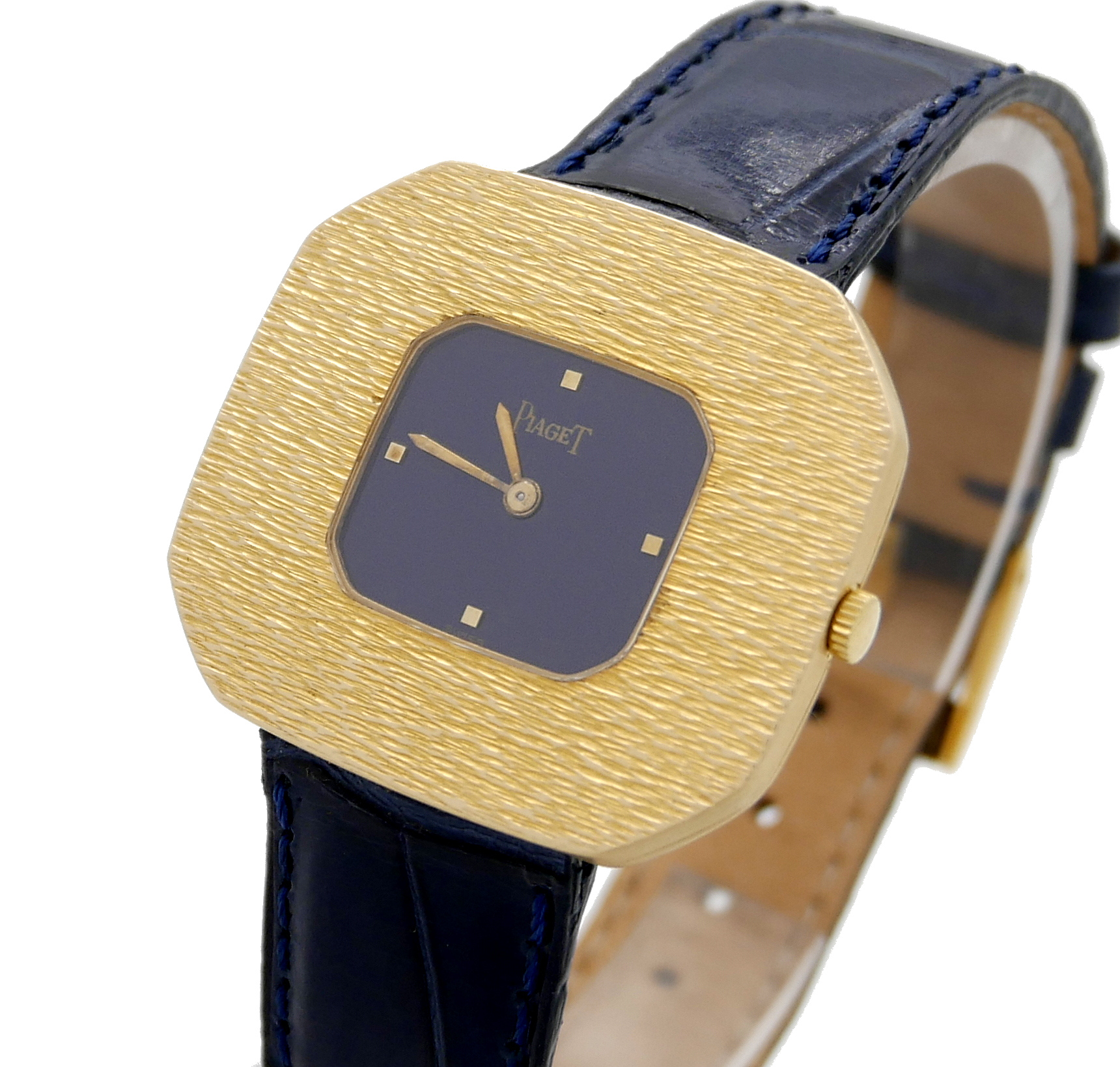 • BRACELET: Blue crocodile strap with gold Piaget Bouckle.
