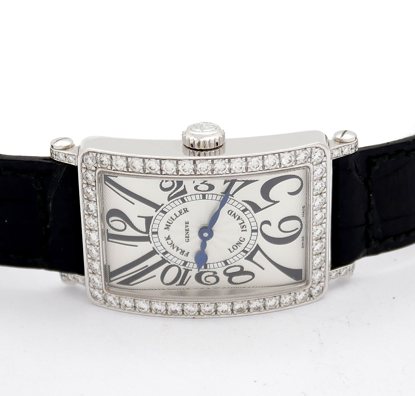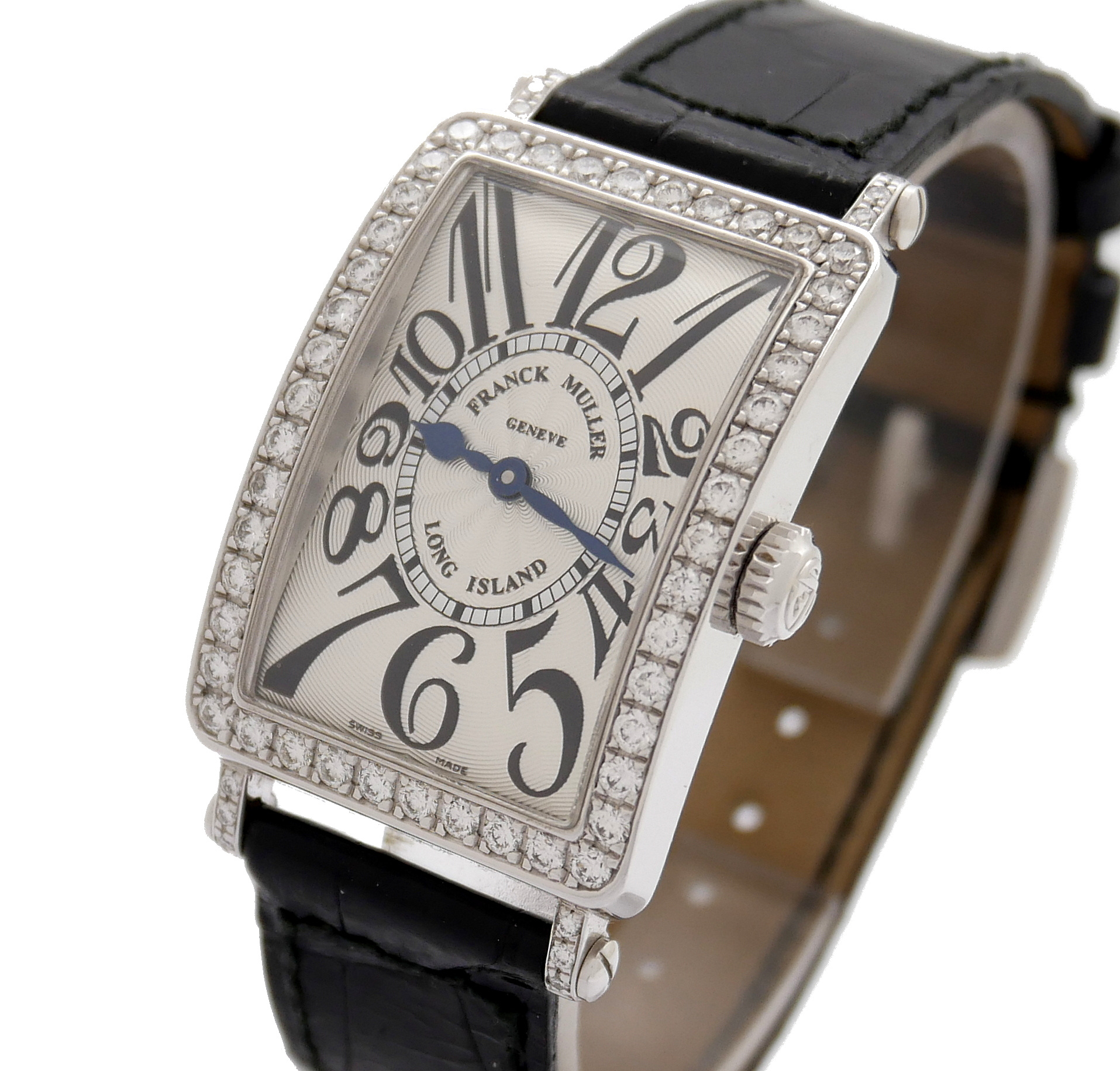 • BRACELET: Black crocodile strap with diamonds white gold buckle.