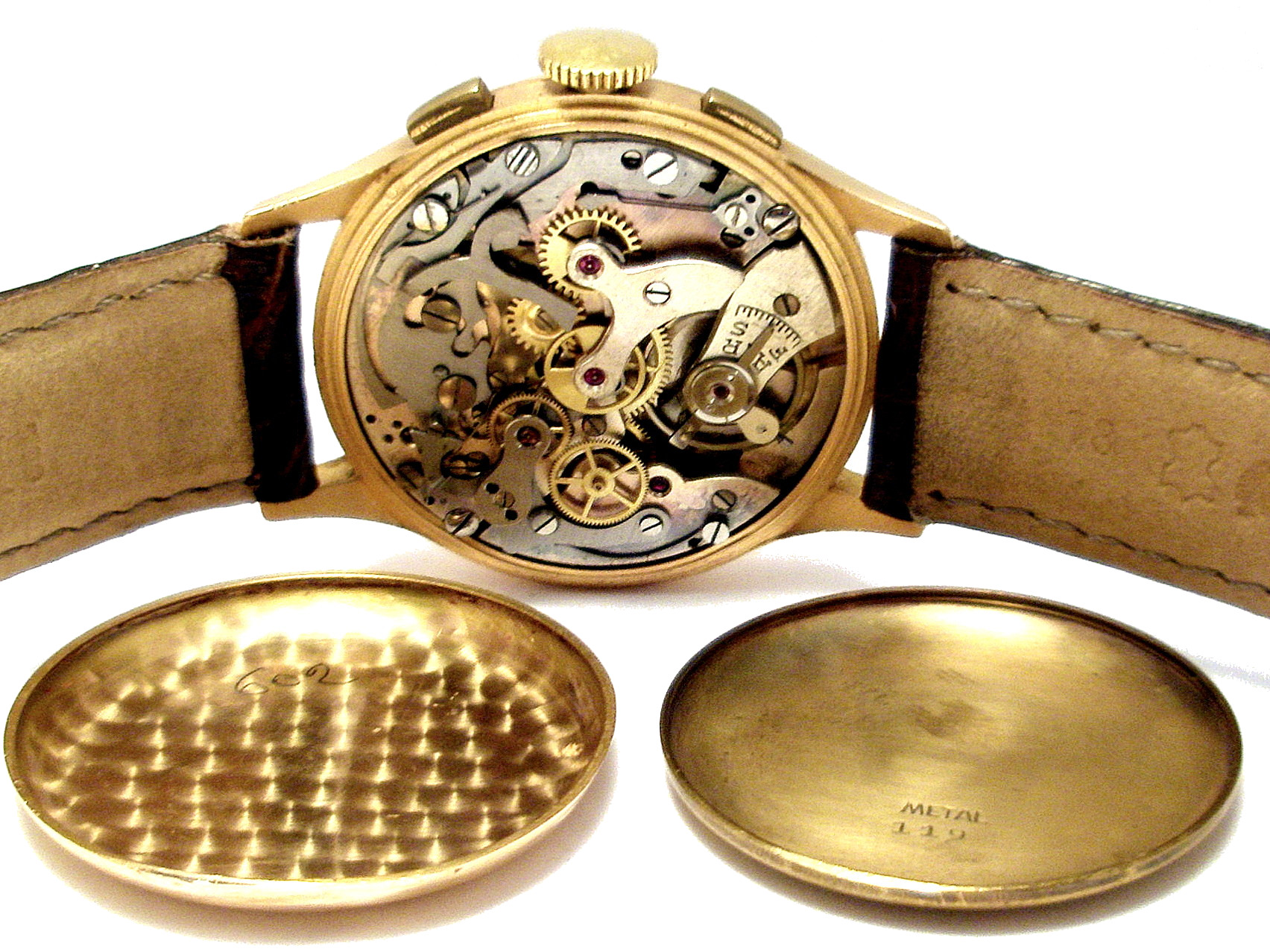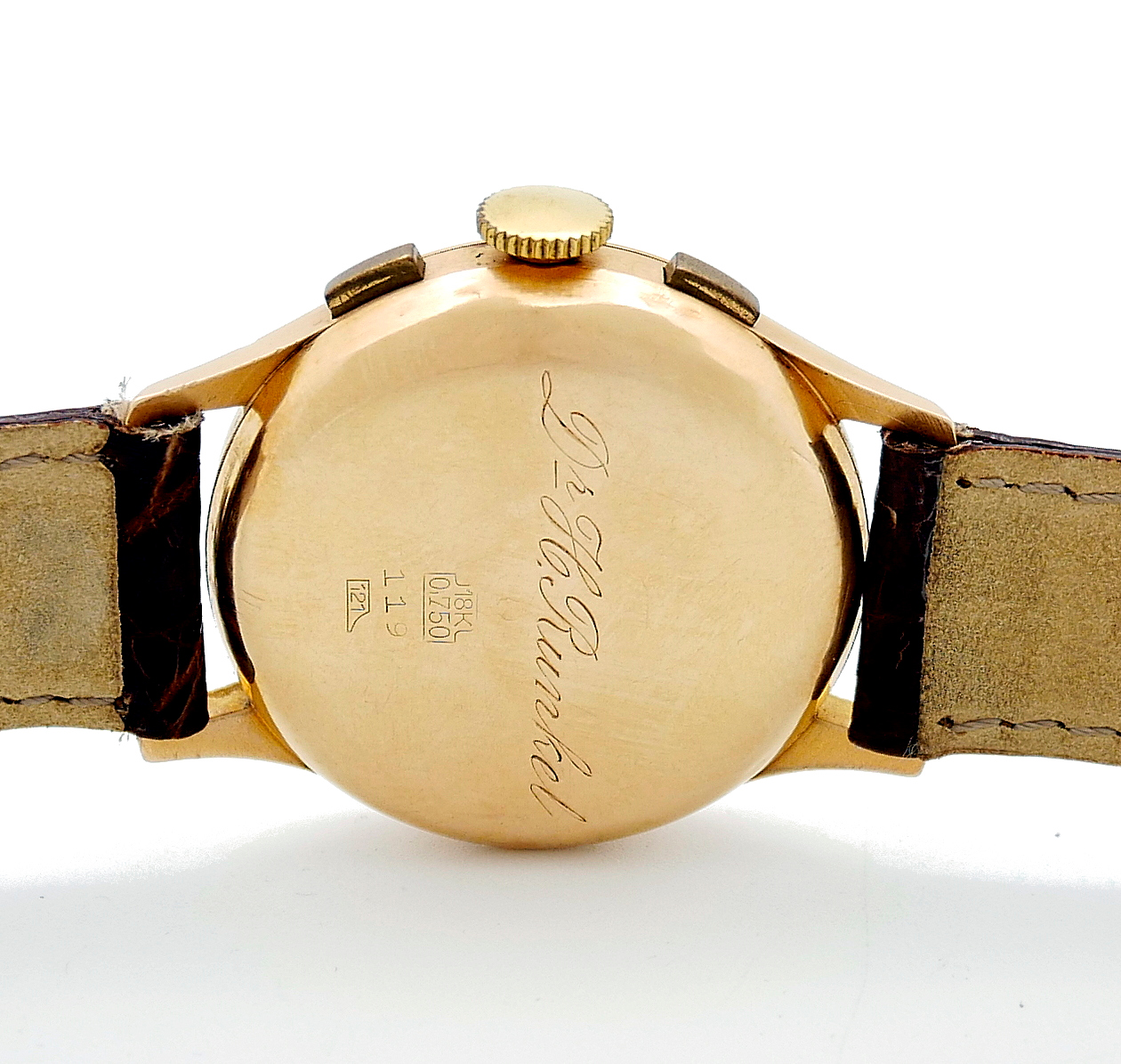 • WATCH: Chronographe Suisse Vintage 50s , Yellow Gold watch with leather strap bracelet